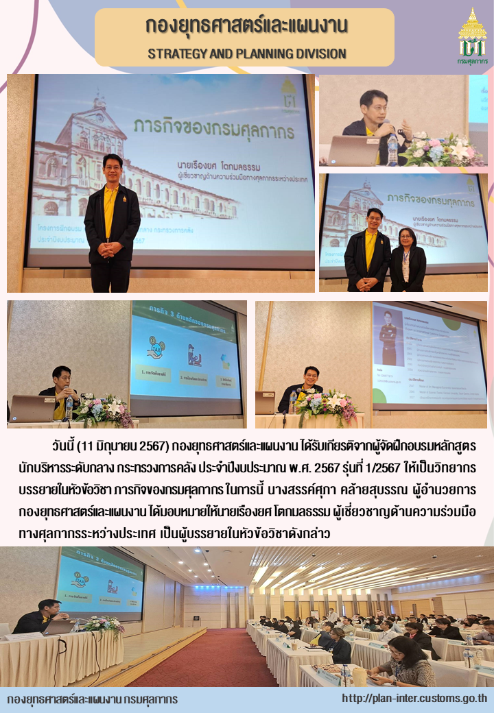 วันที่ (11 มิถุนายน 2567) กองยุทธศาสตร์และแผนงาน ได้รับเกียรติจากผู้จัดฝึกอบรมหลักสูตรนักบริหารระดับกลาง กระทรวงการคลัง ประจำปีงบประมาณ พ.ศ. 2567 รุ่นที่ 1/2567 ให้เป็นวิทยากรบรรยายหัวข้อวิชา ภารกิจของกรมศุลกากร ในการนี้ นางสรรค์ศุภา คล้ายสุบรรณ ผู้อำนวยการกองยุทธศาสตร์และแผนงาน ได้มอบหมายให้นายเรืองยศ โตกมลธรรม ผู้เชี่ยวชาญด้านความร่วมมือทางศุลกากรระหว่างประเทศ เป็นผู้บรรยายในหัวข้อดังกล่าว