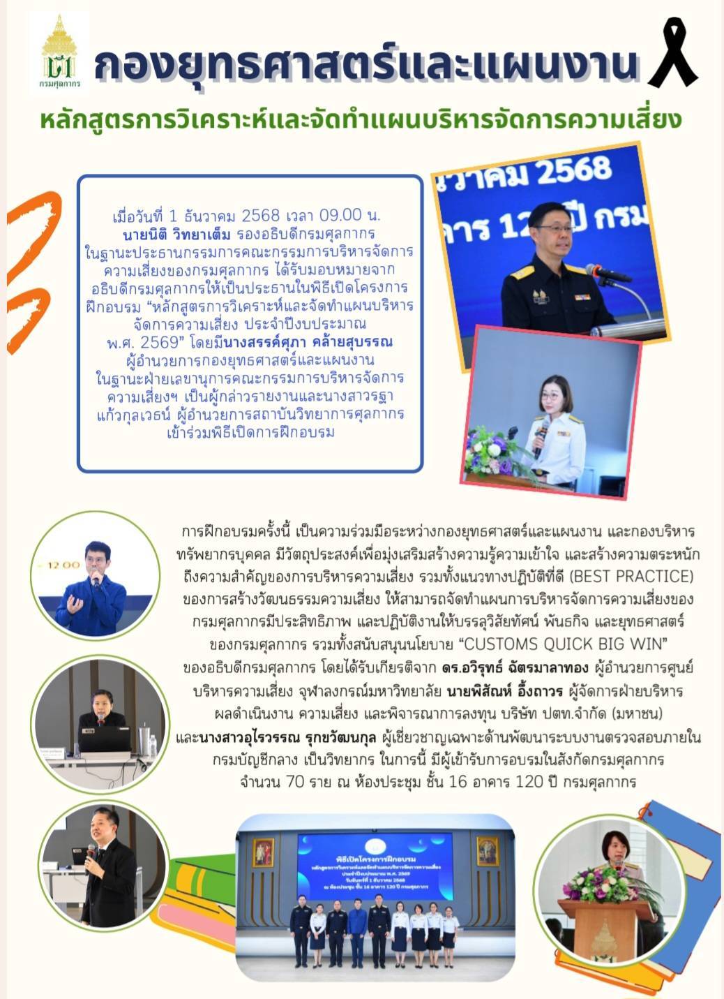 เมื่อวันที่ 1 ธันวาคม 2568 เวลา 09.00 น. นายนิติ วิทยาเต็ม รองอธิบดีกรมศุลกากร ในฐานะประธานกรรมการคณะกรรมการบริหารจัดการความเสี่ยงของกรมศุลกากร ได้รับมอบหมายจากอธิบดีกรมศุลกากรให้เป็นประธานในพิธีเปิดโครงการฝึกอบรม “หลักสูตรการวิเคราะห์และจัดทำแผนบริหารจัดการความเสี่ยง ประจำปีงบประมาณ พ.ศ. 2569” โดยมี นางสรรค์ศุภา คล้ายสุบรรณ ผู้อำนวยการกองยุทธศาสตร์และแผนงาน ในฐานะฝ่ายเลขานุการคณะกรรมการบริหารจัดการความเสี่ยงของกรมศุลกากร เป็นผู้กล่าวรายงาน และนางสาวรฐา แก้วกุลเวธน์ ผู้อำนวยการสถาบันวิทยาการศุลกากร เข้าร่วมพิธีเปิดการฝึกอบรมดังกล่าวด้วย