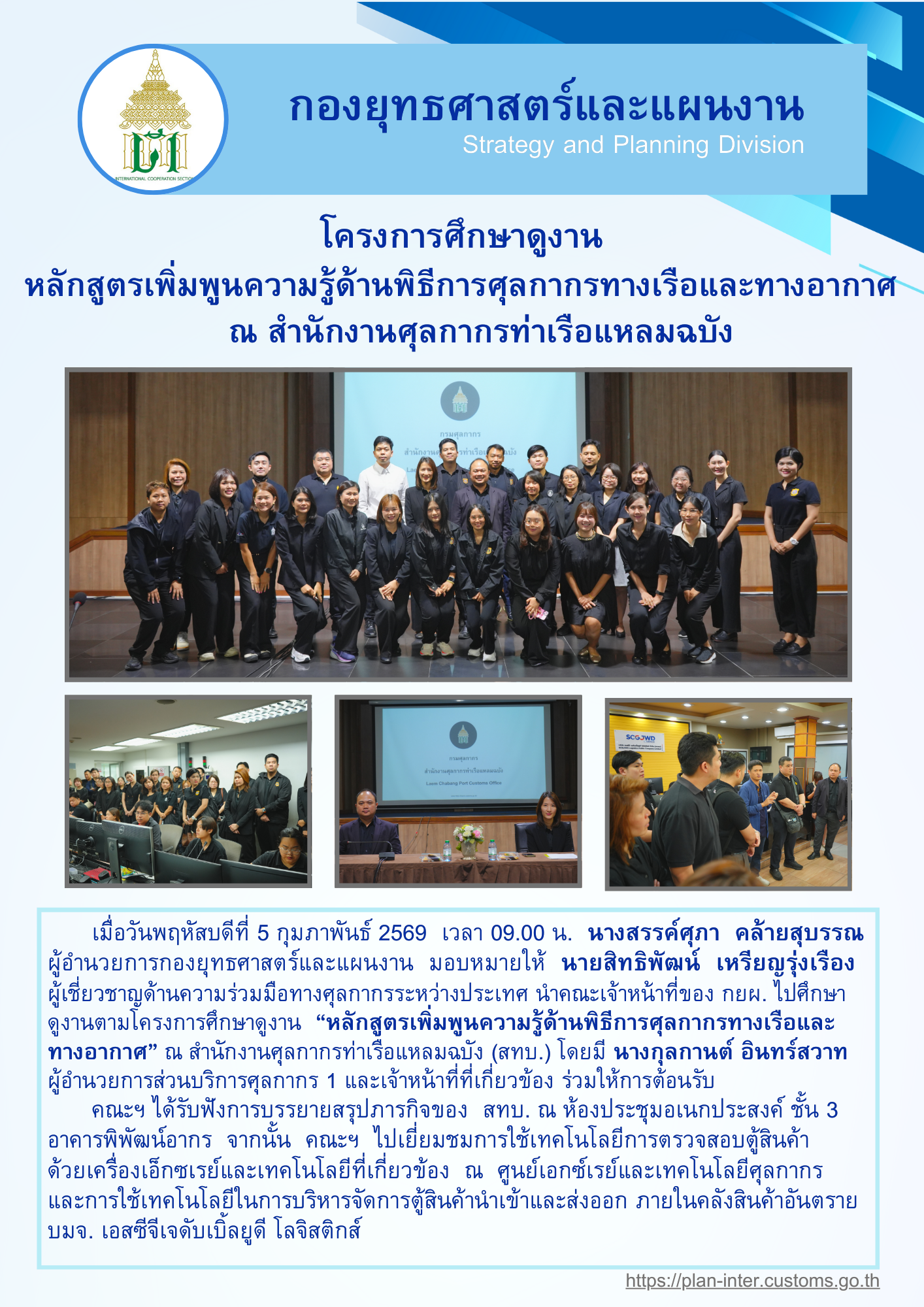 เมื่อวันพฤหัสบดีที่ 5 กุมภาพันธ์ 2569 เวลา 09.00 น. นางสรรค์ศุภา คล้ายสุบรรณ ผู้อำนวยการกองยุทธศาสตร์และแผนงาน มอบหมายให้ นายสิทธิพัฒน์ เหรียญรุ่งเรือง ผู้เชี่ยวชาญด้านความร่วมมือทางศุลกากรระหว่างประเทศ นำคณะเจ้าหน้าที่ของ กยผ. ไปศึกษาดูงานตามโครงการศึกษาดูงาน “หลักสูตรเพิ่มพูนความรู้ด้านพิธีการศุลกากรทางเรือและ ทางอากาศ” ณ สำนักงานศุลกากรท่าเรือแหลมฉบัง (สทบ.) โดยมี นางกุลกานต์ อินทร์สวาท ผู้อำนวยการส่วนบริการศุลกากร 1 และเจ้าหน้าที่ที่เกี่ยวข้อง ร่วมให้การต้อนรับ