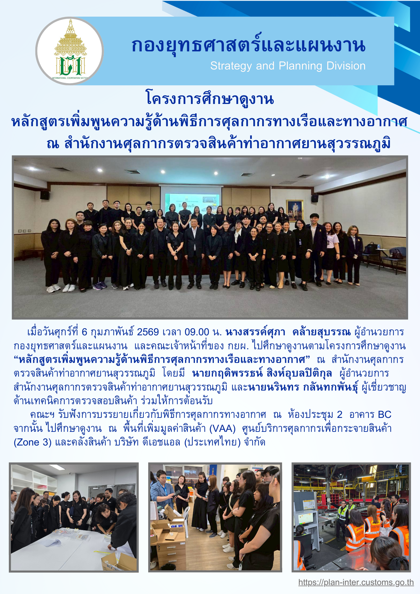 เมื่อวันศุกร์ที่ 6 กุมภาพันธ์ 2569 เวลา 09.00 น. นางสรรค์ศุภา คล้ายสุบรรณ ผู้อำนวยการกองยุทธศาสตร์และแผนงาน และคณะเจ้าหน้าที่ของ กยผ. ไปศึกษาดูงานตามโครงการศึกษาดูงาน “หลักสูตรเพิ่มพูนความรู้ด้านพิธีการศุลกากรทางเรือและทางอากาศ” ณ สำนักงานศุลกากรตรวจสินค้าท่าอากาศยานสุวรรณภูมิ โดยมี นายกฤดิพรรธน์ สิงห์อุบลปิติกุล ผู้อำนวยการ สำนักงานศุลกากรตรวจสินค้าท่าอากาศยานสุวรรณภูมิ และนายนรินทร กลันทกพันธุ์ ผู้เชี่ยวชาญ ด้านเทคนิคการตรวจสอบสินค้า ร่วมให้การต้อนรับ