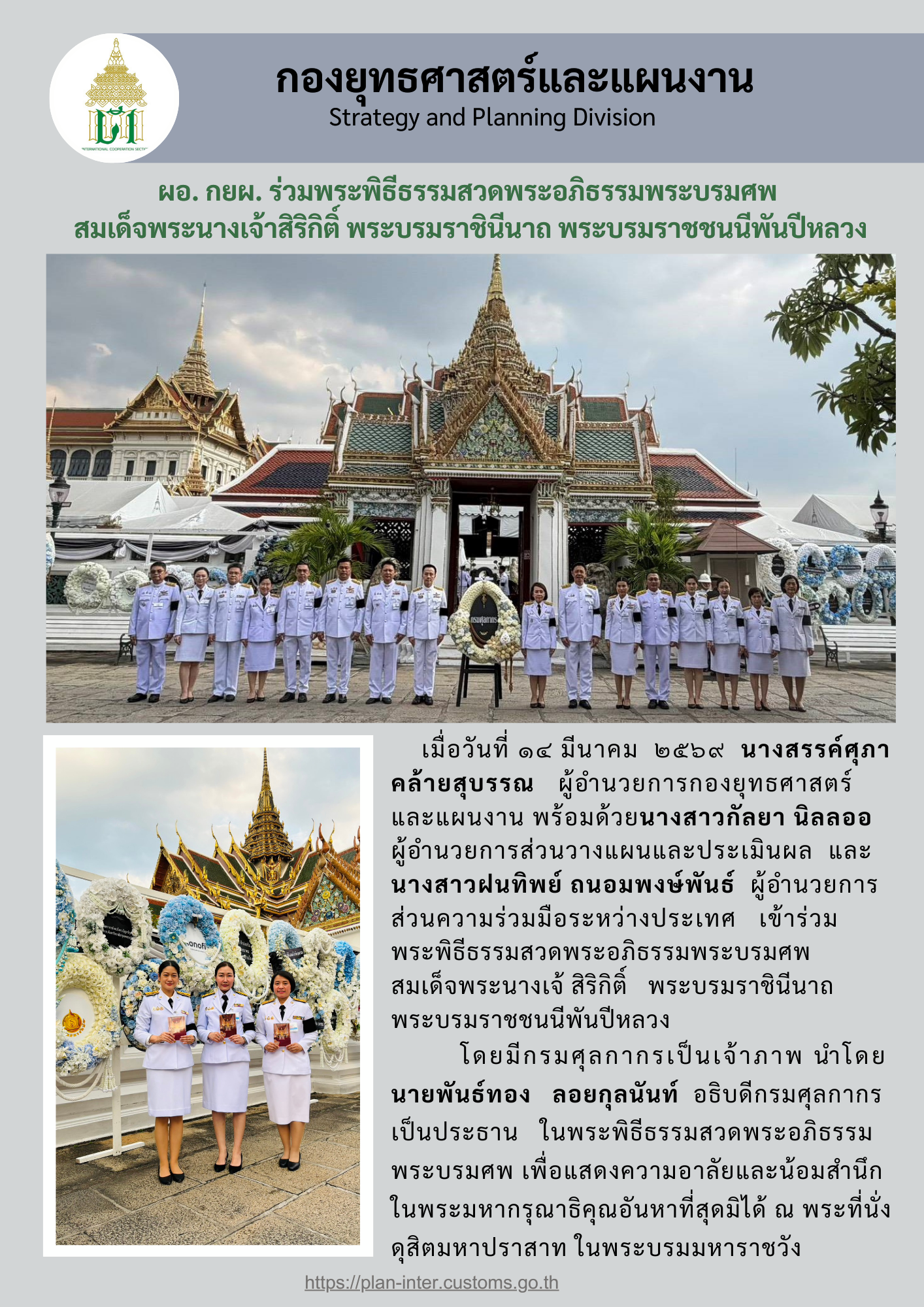 วันที่ ๑๔ มีนาคม ๒๕๖๙ นางสรรค์ศุภา คล้ายสุบรรณ ผู้อำนวยการกองยุทธศาสตร์และแผนงาน พร้อมด้วยนางสาวกัลยา นิลลออ ผู้อำนวยการส่วนวางแผนและประเมินผล และนางสาวฝนทิพย์ ถนอมพงษ์พันธ์ ผู้อำนวยการส่วนความร่วมมือระหว่างประเทศ เข้าร่วมพระพิธีธรรมสวดพระอภิธรรมพระบรมศพ สมเด็จพระนางเจ้าสิริกิติ์ พระบรมราชินีนาถ พระบรมราชชนนีพันปีหลวง